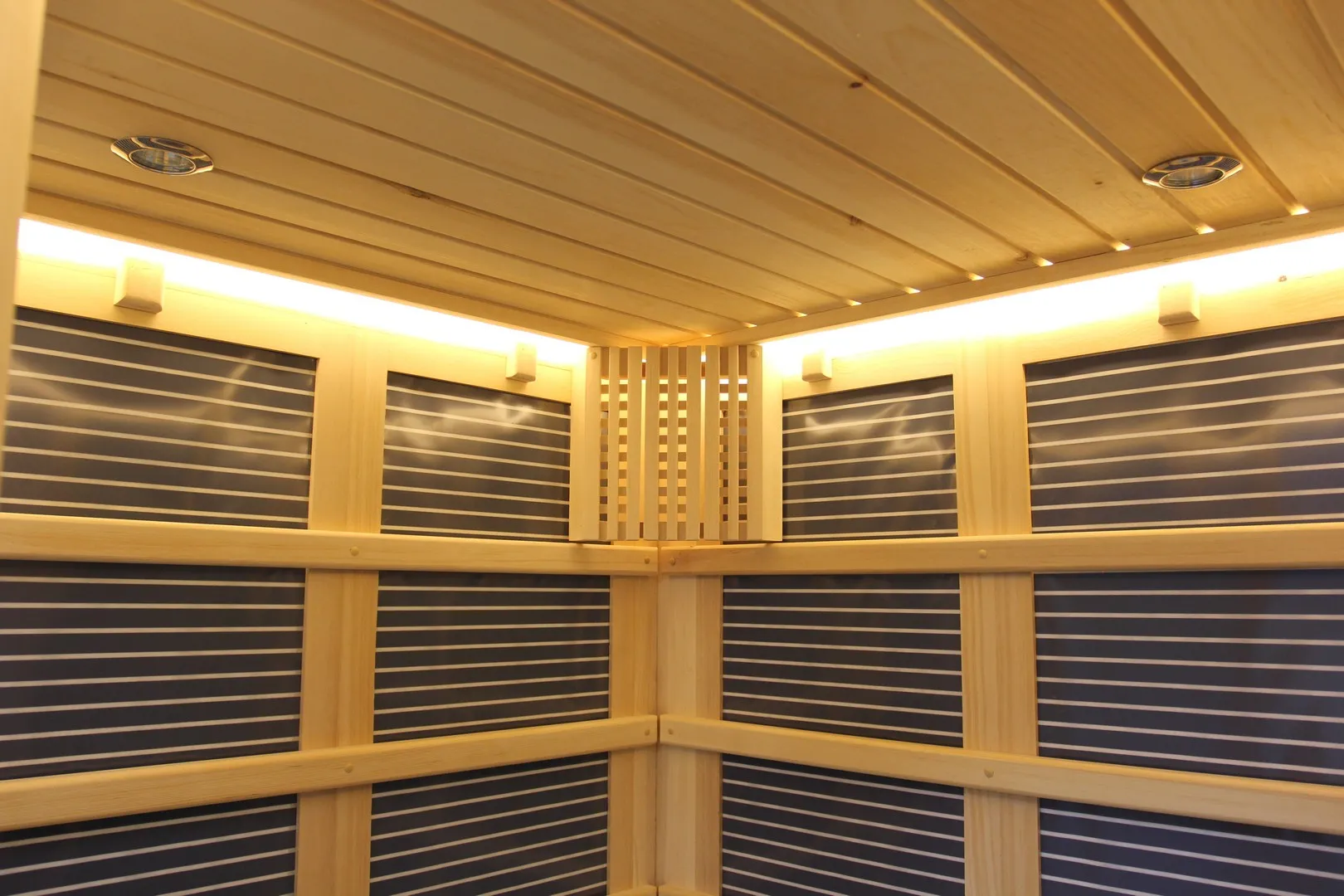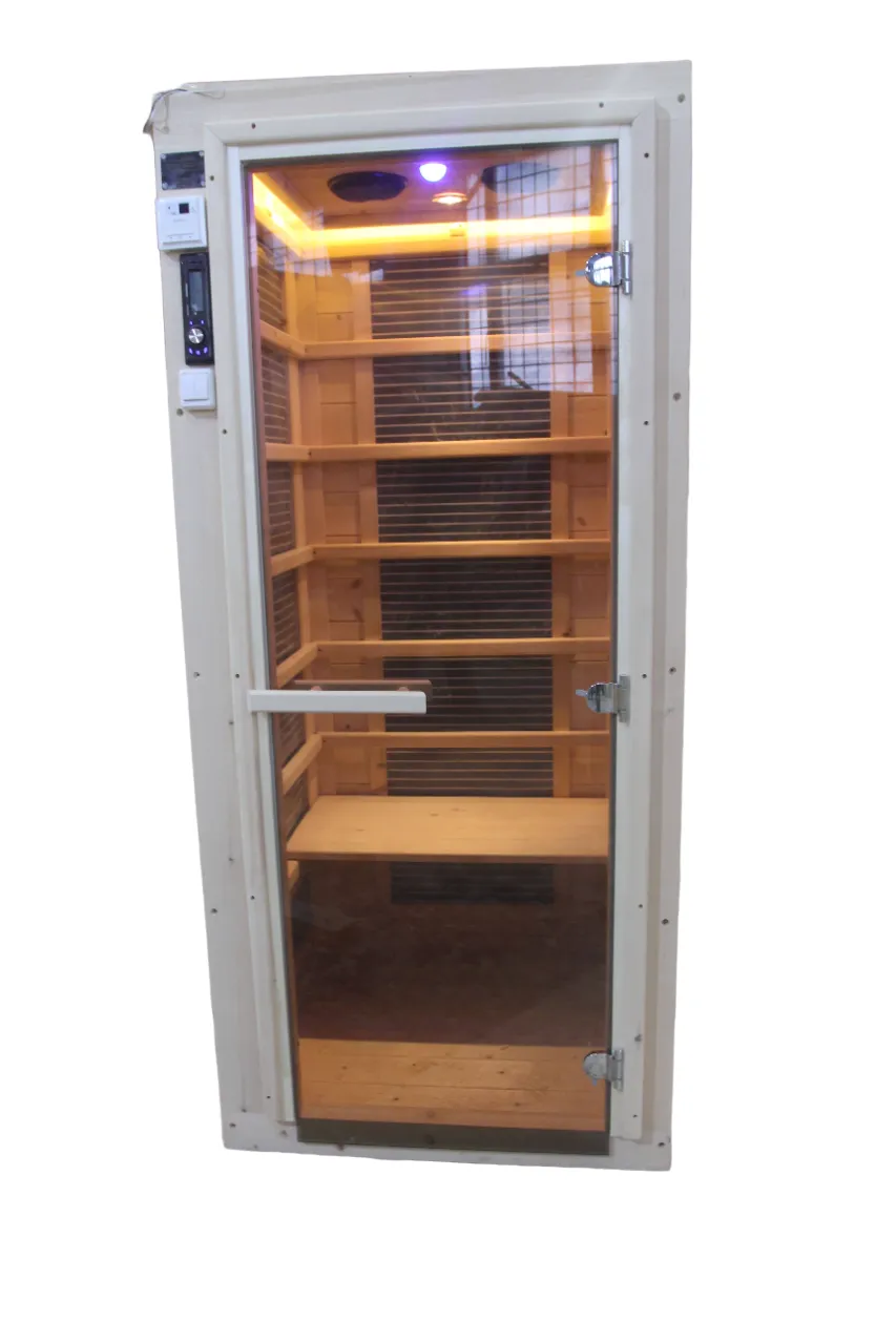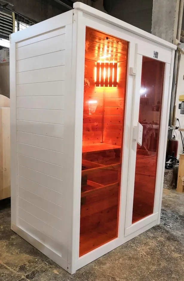 Это специально оборудованная кедровая кабина для прогрева тела человека сухим теплом. Воздух в таких парных не нагревается. Инфракрасные лучи воздействуют на тело, равномерно прогревая мышцы, суставы и органы. Керамические излучатели похожи на лампы, имеют высокую температуру нагрева, поэтому защищены противоожоговыми решетками. Тело человека в таких саунах нагревается интенсивнее. Работает кабина за счет электричества. Установка сауны в угол, позволяет рационально использовать пространство помещения. Подходит как для домашнего использования, так и для коммерции.